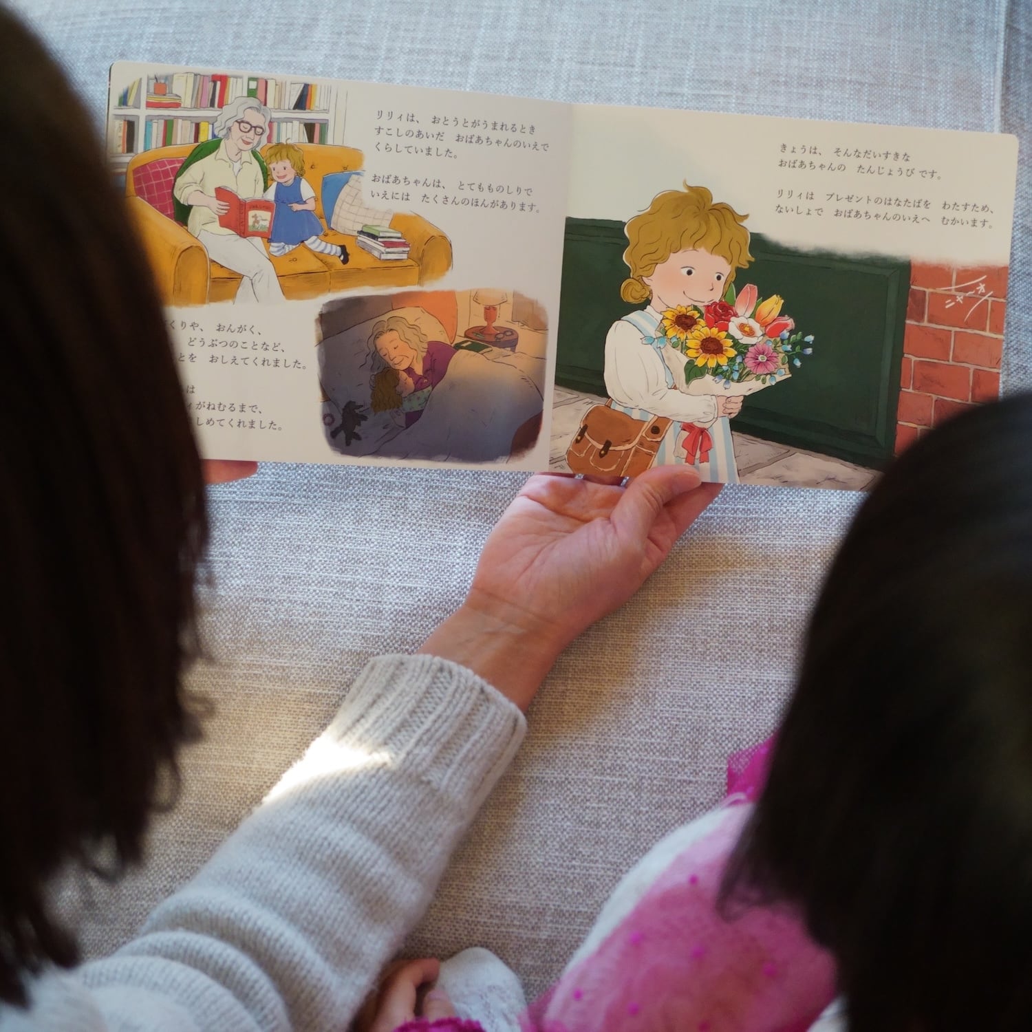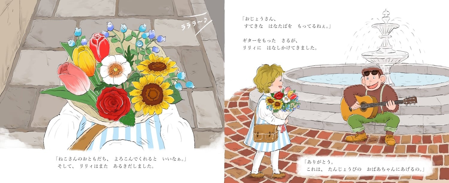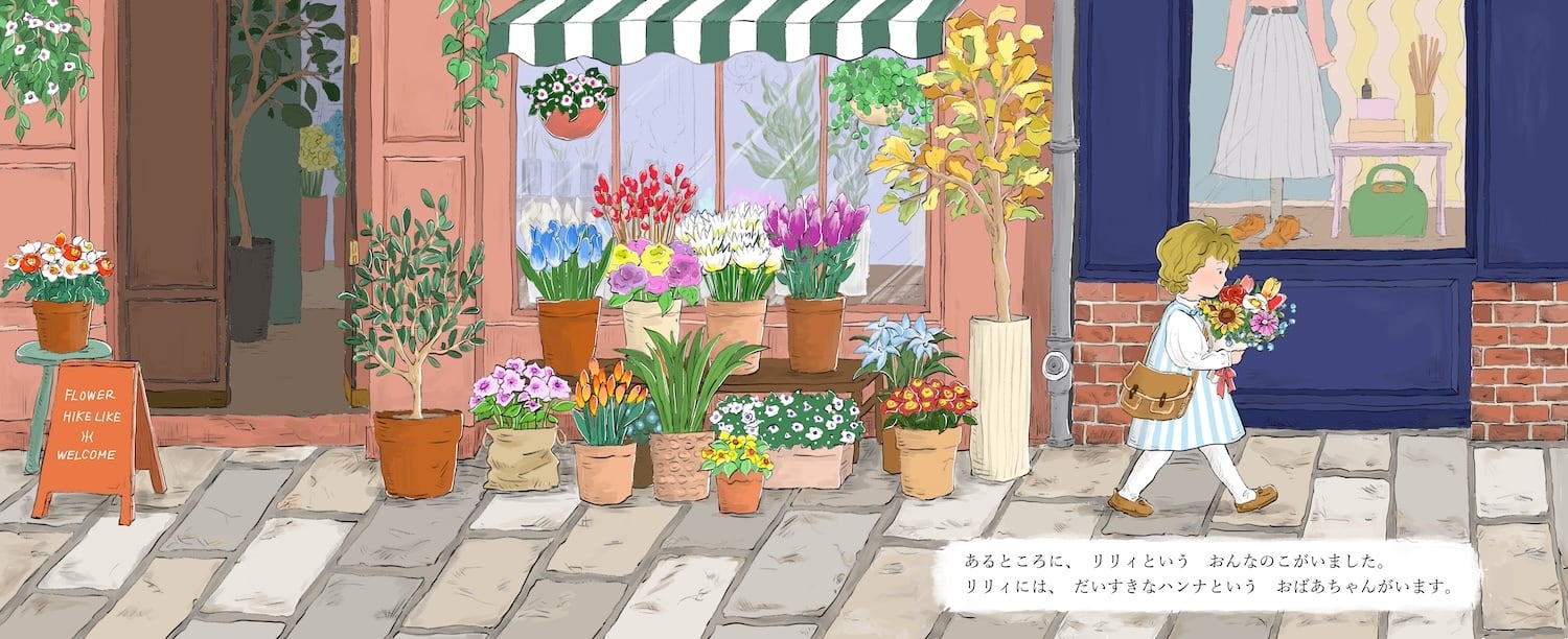 リリィは、プレゼントの花束を渡すためおばあちゃんの家へ歩いていきます。